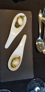 The Amuse-Bouche for one of the nights; Mussel marinated in pistou, topped with crème fraîche and radish